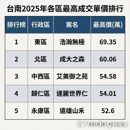 信用管制下,台南房市高價交易仍具支撐,根據實登統計,2025年台南各行政區最高單價統計,前5名全面站上「5字頭」,其中,東區由指標案「浩瀚無極」以每坪69.35萬元奪下年度冠軍,成為台南最高單價王。