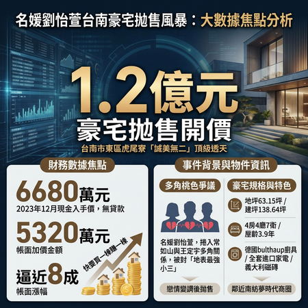 名媛劉怡萱與已婚醫美總裁常如山爆出感情糾葛,並傳出與王定宇關係曖昧,被封為「地表最強小三」。根據售屋網站顯示,劉怡萱已悄悄委託房仲,以1.2億元拋售位於台南市東區的頂級豪宅,對比2023年入手價6680萬元,已加價5320萬元出售,「快要買一棟賺一棟」。