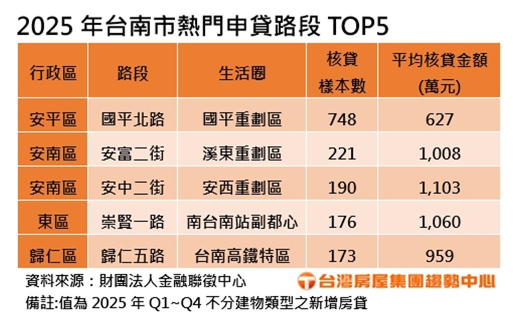 台灣房屋集團依金融聯徵中心新增房貸資料統計,南市2025年核貸筆數最多路段,由安平區「國平北路」748件最多,榮登年度最熱門路段,該路段平均房貸額約627萬元,主因是區段屬安平五期重劃區旁國平重劃區,近年來新屋供給包括和逸建設「水星光」、興富發「愛琴海」等,主力房價新屋多屬3字頭行情,中古屋則落在2字頭房價。