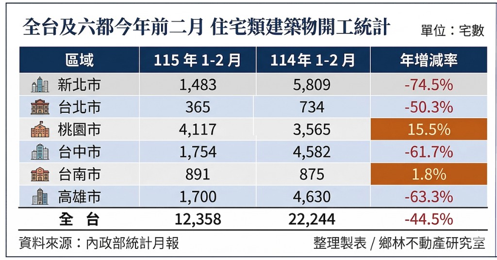 不過,根據內政部統計,今年1至2月全台住宅類建築物開工戶數僅有12,358戶,是自107年以來近八年最低,比起去年同期22,244戶少了近一萬戶,年減幅逾44%,幾乎是腰斬局面,六都之中除了桃園開工年增15.5%及台南1.8%之外,其餘開工宅數皆呈負成長、且年減率均超過50%,顯示房市開工動能大幅萎縮。