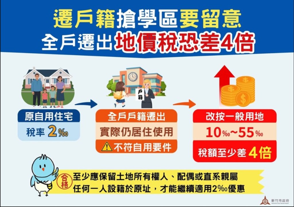 新竹陳女名下土地原適用自用住宅用地優惠稅率2‰,為讓孩子就讀明星學校,去年將全家戶籍遷出,即使仍住在原址,今年起改按10‰一般用地稅率課徵地價稅,稅額暴增至少4倍。新竹市稅務局提醒,遷戶籍至少保留1人設籍於原址,才能繼續適用自用住宅用地稅率。