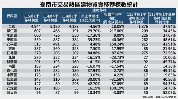 此外,仁德區本季新屋移轉占比高達72.56%,顯示新成屋交屋集中,為該區域交易量成長的重要來源。