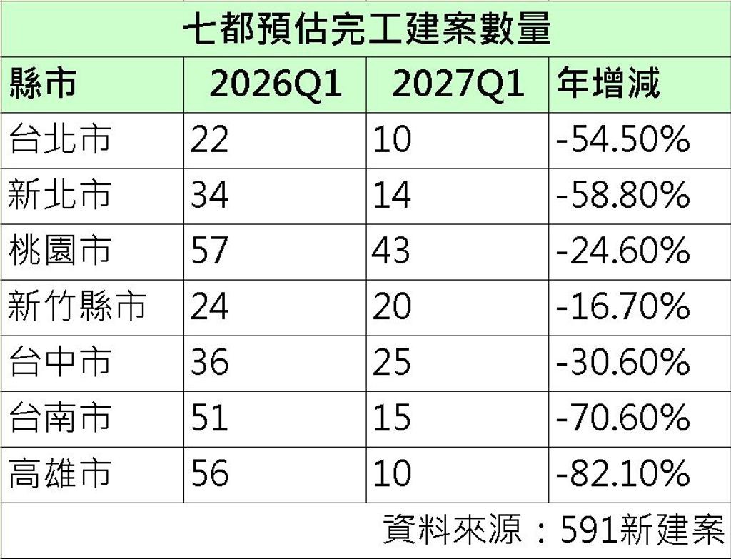 根據《591新建案》調查統計,預估北市及新北市今年第一季建案完工件數分別為22筆及34筆,但到了明年第一季則下滑至10筆及14筆,減幅分別為54.5%及58.8%;高雄市今年首季建案完工數量達56筆,但明年第一季下滑至10筆,減幅超過8成,高居七都之冠;台南市則由51筆下滑至15筆,減幅亦高達7成。