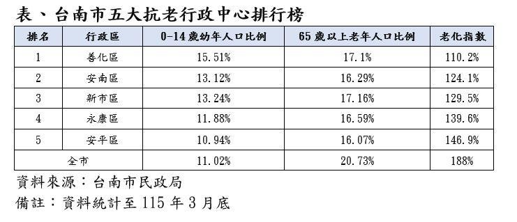 具體觀察善化區的人口組成,0-14歲幼年人口占比高達15.51%為全市最高,65歲以上老年人口比例占17.1%,其老化指數110.2%為全市最低。緊隨其後的抗老熱區還包括安南區124.1%、新市區129.5%、永康區139.6%以及安平區146.9%。