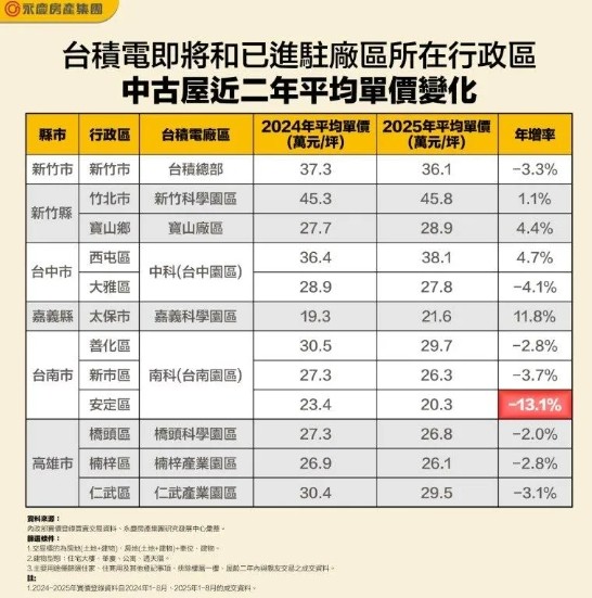 而嘉義縣的太保市房價反而逆勢上漲11.8%居冠。陳金萍補充,近年太保市發展題材不斷,除台積電將進駐嘉義科學園區外,「華泰名品城」Outlet也得標高鐵特定區土地,未來發展潛力可期。再加上嘉義高鐵站周邊仍有廣大腹地可開發,吸引建商積極進場。由於房價基期較低,加上科技人才剛需買盤支撐,在眾多題材助攻下,當地預售價格已反映市場上漲預期,也帶動中古屋價格走升。