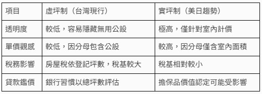 - 缺點: 換算後的每坪單價會顯著高於虛坪制。