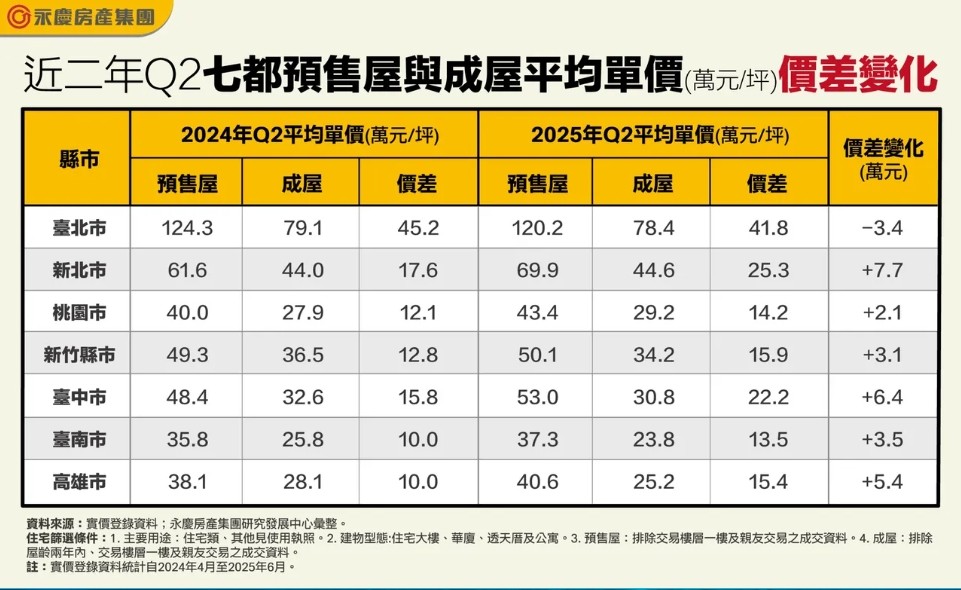 至於台北市,是七都中預售與成屋價差縮小的都會區。由於台北市房市需求較為穩定,加上成屋市場受惠於市中心稀缺性與地段優勢,價格相對抗跌,即便中古屋也具備替代效應,支撐成屋價格不至於明顯下修,因此整體價格不若其他縣市變動大,但陳金萍指出,2025年第二季台北市的成屋平均單價是78.4萬元,而預售屋則約120.2萬元,兩者價差高達41.8萬元,若想入住北市,成屋價僅需預售屋約六成五的價格,不僅價格更具吸引力,還有立即入住、降低等待與不確定風險等優勢,對於有意購屋的民眾來說,是進駐台北市相對務實的選擇。