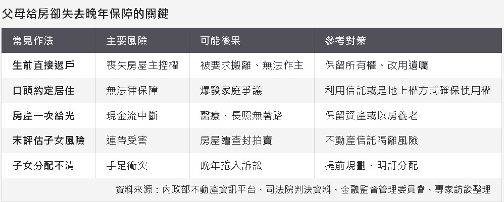 專家普遍指出,提早把房子給子女,本意往往是愛與付出,但若缺乏完整規劃,反而可能讓父母在晚年失去選擇權與尊嚴。