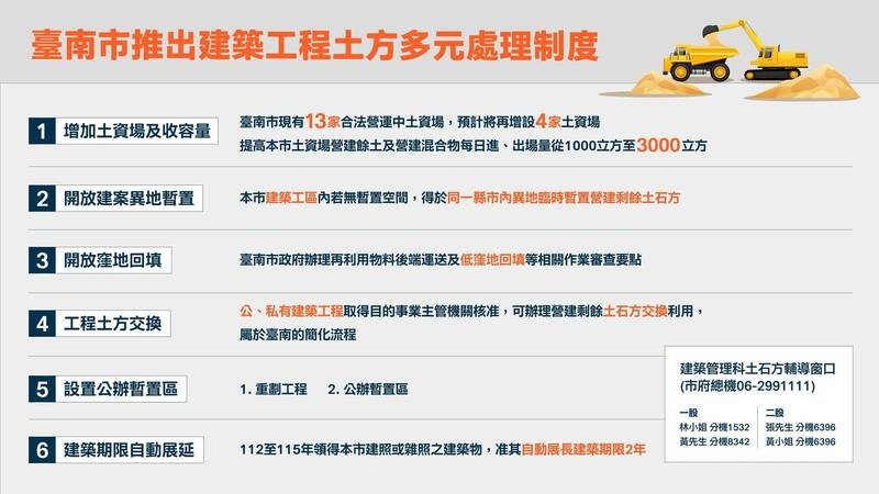 為提升建築工程剩餘土石方去化效率,並解決工地土方暫置與處理問題,南市推動「建築工程土方多元處理制度」,透過增加土資場容量、開放異地暫置、推動窪地回填、建立土方交換制度、設置公辦暫置區及延長建築期限等6大策略,強化土方調度與管理機制,兼顧工程需求與環境永續,協助公共與民間建設順利推動。