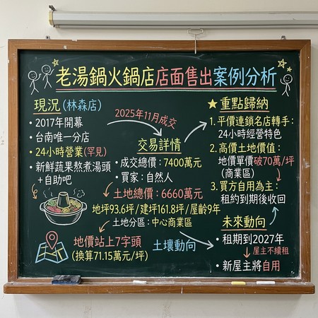 「老湯鍋」林森店2017年開幕,是台南罕見的24小時營業火鍋店,主打新鮮蔬果熬煮湯頭及自助吧吃到飽,吸引不少夜貓族用餐,根據實登,該店面去年11月以7400萬元售出,據查,新買家為自然人,信義房屋專家表示,該區交通條件將大幅改善,地價站上7字頭。