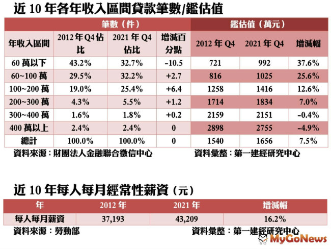 千金難買早知道!10年前沒買,現在至少得多花270萬!第一建經統計財團法人金融聯徵中心資料,年收在60萬以下的購屋族,房貸平均鑑估值,2012年Q4僅721萬元,2021年購屋族貸款房屋鑑估值則增加271萬,達992萬元,等於同樣年薪的購屋族,10年後的購屋壓力指數大增37.6%!以近10年經常性薪資變化,從2012年每人每月37,193元,到2021年43,209元,漲幅16.2%,反映薪資追不上房價增長的速度!