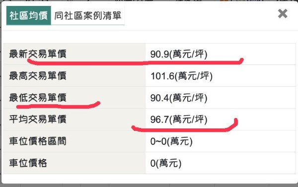 為協助朋友出價,林利州查詢了內政部實價登錄網站,其中提供「同社區案例」功能的選項,點選之後會出現該社區的均價,以朋友想買的大樓來看,最低成交價格每坪90.4萬元,最高成交價格每坪101.6萬元,平均交易單價96.7萬元,而最新交易單價是8月18日的每坪90.9萬元。