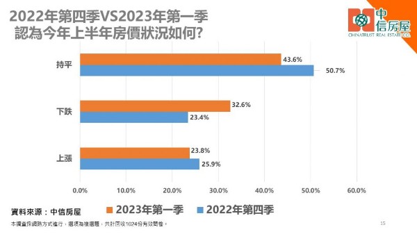儘管多項打炒房政策影響房市交易,但房價未有顯著下滑現象,整體市況陷入僵持期,根據中信房屋調查,有43.8%的民眾認為2023年上半年的房價依舊穩固,但與上季調查50.7%,下滑了6.9個百分比,有32.6%認為房價將下跌,23.8%認為房價將上漲,相比上季調查,民眾看跌心態逐漸加強。
