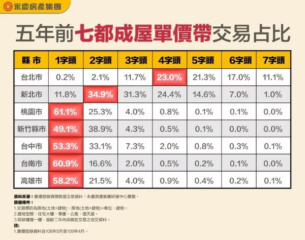 近年各地房價全面上漲。永慶房產集團根據實價資料,比較近五年七都成屋主力成交單價變化,5年前,桃園以南的五都成屋主力單價全都在1字頭,台北為4、5字頭,新北的主力單價為2字頭。