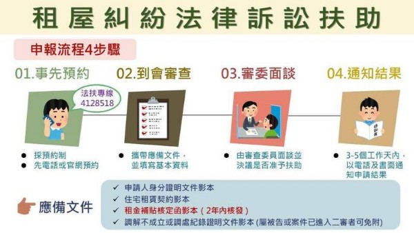 內政部說明,本次新增的訴訟扶助主要是針對領有租金補貼的租屋民眾,只要具備「近2年內經主管機關審核符合租金補貼資格」及租賃糾紛「經調解或調處仍無法解決」兩項者,均可向法律扶助基金會申請。申請方式採預約制,須檢附身分證明文件、住宅租賃契約、租金補貼核定函,以及調解不成立或調處紀錄證明,經審核通過後即可適用。