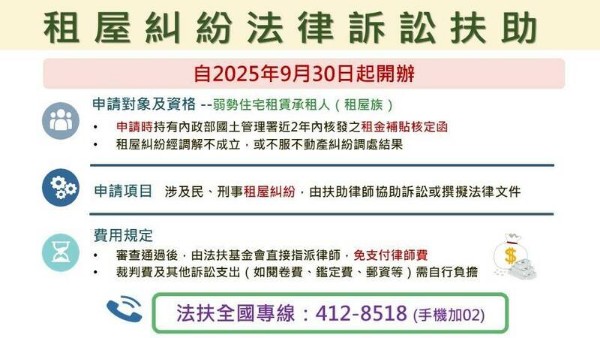 內政部表示,為了讓租屋民眾在面臨租屋糾紛時能獲得正確法律知識,自去年8月起已與法律扶助基金會合作推動「住宅租賃糾紛電話法律諮詢服務」,提供專線 412-8518(手機撥打請加02,接通後轉2再轉6),由專業律師即時提供意見。截至114年8月底,已累計服務5164件,平均每月近400件。