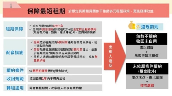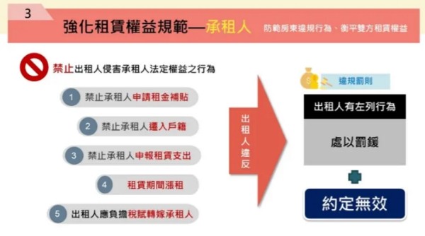 保障租客權益: 房東不得禁止租客申請租金補貼、遷入戶籍及申報租金費用,也禁止在租賃期間漲租、將應負擔稅負轉嫁給房客。違規的話,相關約定無效並處以罰則,最重30萬元。