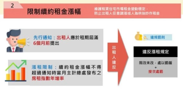 漲幅不得超過當月行政院主計總處公布的房租指數年增率,以確保漲幅合理。