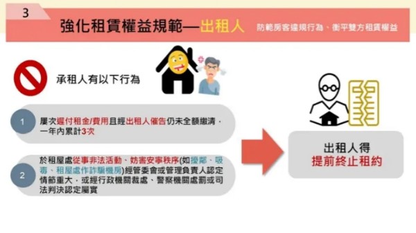 新增「租霸下車條款」,租客如惡意欠租、從事非法活動,房東有權提前終止租約。如果租客拒絕搬離,房東可直接聲請強制執行。(圖/內政部提供)