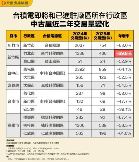 在台積電的各大廠區中,竹北市今年交易較去年量縮69.6%,為榜上交易量減幅最多的一區。永慶房屋研展中心副理陳金萍指出,今年至今,在銀行房貸緊縮與第七波信用管制續行下,以及美國又宣布關稅政策下,房市交易未見起色。而且,目前買方購屋心態保守,期待房價有一定的降幅才願意進場,但竹北市今年中古屋的平均單價較去年不減反增,平均房價更已來到4字頭,使不少買方保持觀望,因此量縮幅度最明顯。