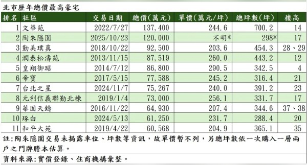 根據實價,歷年來北市十大最高總價豪宅排行榜,由位於松山區的「文華苑」拿下,該社區次高樓層2戶,2022年7月由龍巖集團家族以總價13.74億元買下,為有實價以來單筆交易總價最高之豪宅。