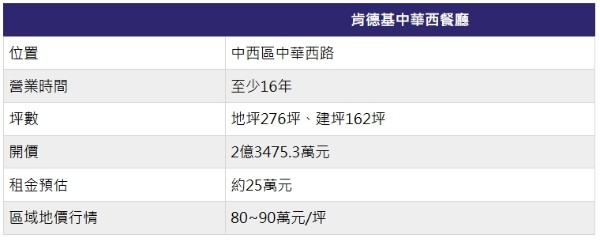 大型連鎖速食品牌往往展店選址都相當謹慎,多在當地熱門商圈開店,肯德基中華西餐廳位於中西區中華西路,地坪276坪、建坪162坪,土地使用分區為住5,近期屋主開價2億3475.3萬元出售,換算地價單坪約85萬元。根據銷售資訊指出,目前有租客穩定收租,租期則未透露。