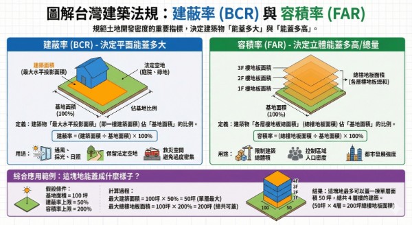 在台灣挑房子,不管你是在看預售屋、想買中古屋,或是手上有土地準備做危老重建,幾乎都逃不過兩個最常被提起的關鍵名詞:建蔽率與容積率。