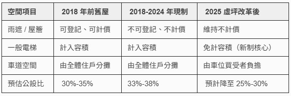 - 新制:將一般電梯改為免計容積,並限制管委會空間(如管理室、交誼廳)為總容積的 1%。