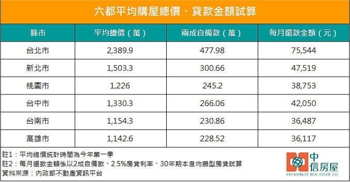 根據內政部不動產資訊平台統計,截止到今年第一季,六都的平均購屋總價分別為台北市2389.9萬元、新北市1503.3萬元、桃園市1226萬元、台中市1330.3萬元、台南市1154.3萬元,以及高雄市的1142.6萬元。