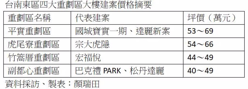 圖   台南東區四大重劃區大樓建案價格摘要