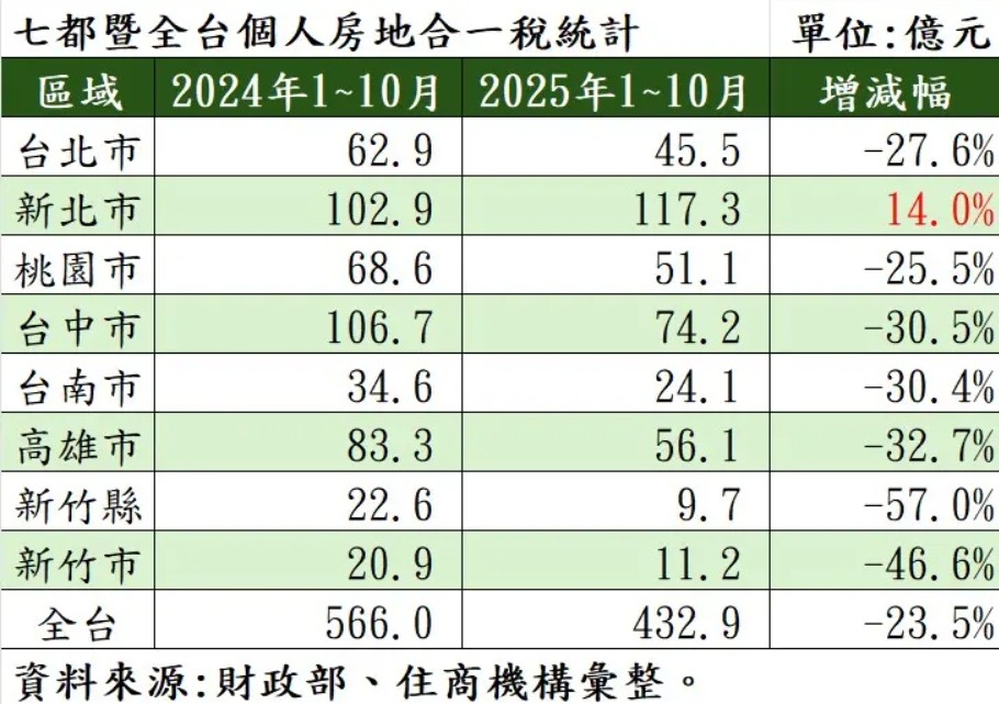以往「房地合一稅收王」的台中市,今年1到10月稅收達74.2億元,屈居全台亞軍,較去年同期減少30.5%;台南市為24.1億元,與去年同期減少30.4%;高雄市則達56.1億元,跌幅32.7%;整體而言,全台1~10月個人房地合一稅收共達432.9億元,相較2024年同期跌幅達23.5%。