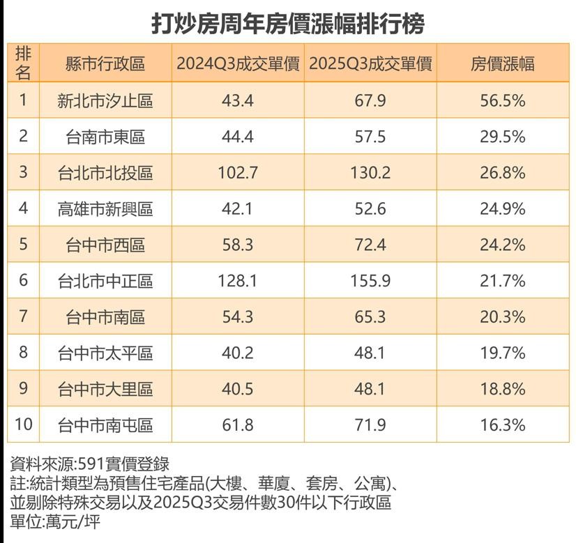 根據統計,七都中仍有十大行政區房價年漲幅超過1成,其中,新北汐止去年第三季成交價為43.4萬元,今年第三季已攀升至67.9萬元,年漲幅高達56.5%,驚人漲幅令人目瞪口呆。