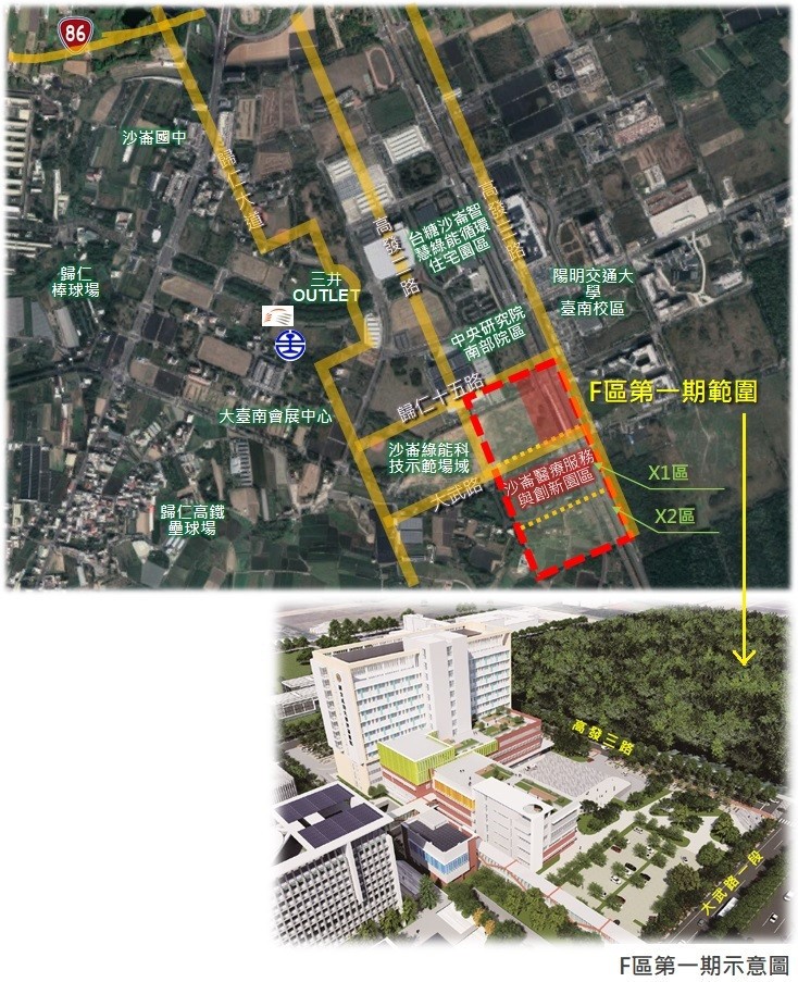 圖  成大沙崙醫療服務與創新園區已啟動,第1階段(F區第1期)位置示意圖。(自由時報/成大提供)