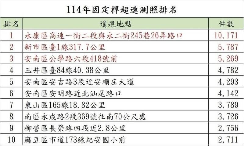 圖   台南2025測速照相固定桿違規取締,公布前十大排名。(南市警察局提供)