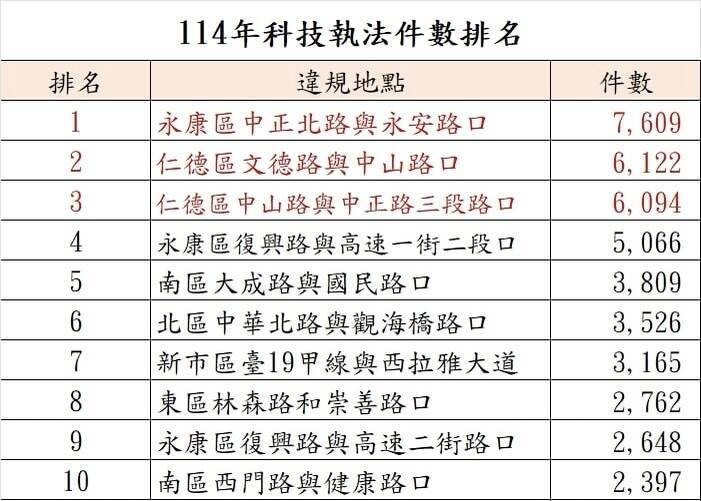 科技執法前十大分居2、3名的都在仁德區,分別是「中山路與文德路口」、「中山路與中正路三段路口」,各取締6122件、6094件,交大籲請民眾確實遵守號誌行駛,平安最重要。