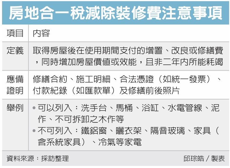 舉例來說,像是洗手台、浴缸、水電管線等支出,就是可列報的裝修費;如曬衣架、冷氣、家具等,就不可列入。
