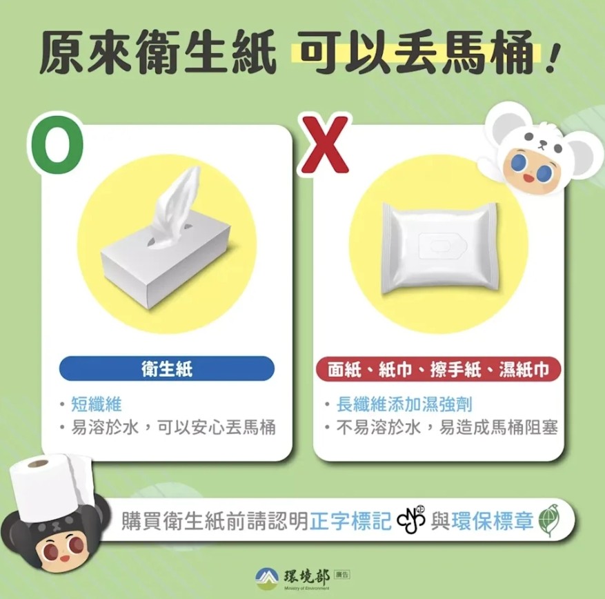 若是像面紙、濕紙巾、衛生棉條、紙巾類等長纖維產品因為添加濕強劑,不易快速分散,仍應丟垃圾桶。環保署也已與台灣區造紙工業同業公會及衛生紙製造廠商進行溝通,未來將增加可丟入馬桶等商品標示或加大用途說明等方式,讓民眾方便辨識。