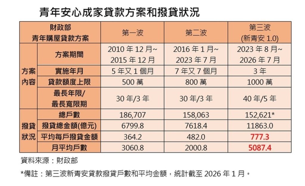 新青安將在今年七月截止,根據財政部資料,截至2026年1月,新青安撥貸總金額達1兆1,863億元,已有15萬2,621戶撥貸,平均每月有5,087戶申請,平均撥貸金額777萬元。